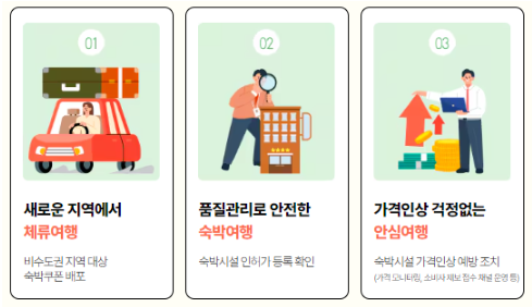 - 2차 발급된 숙박 쿠폰은 7만 원 이상의 숙박 요금에 3만 원, 7만 원 미만의 숙박 요금에 2만 원 할인 쿠폰을 사용할 수 있습니다.